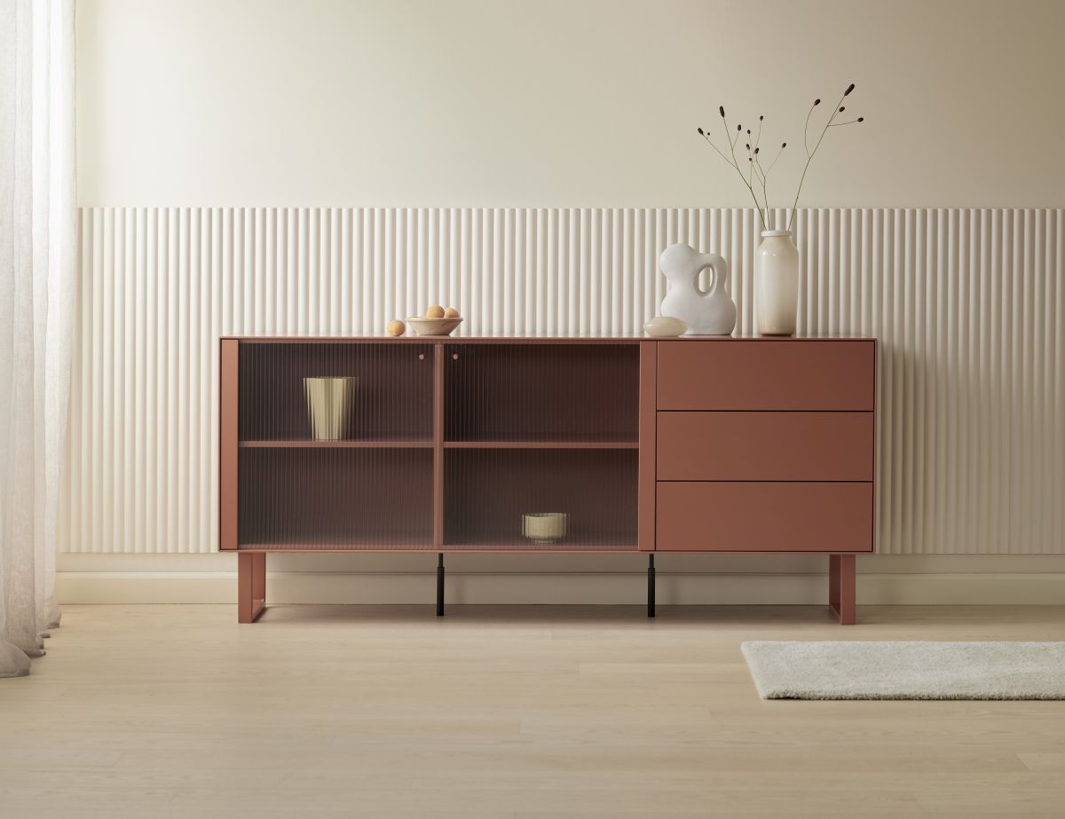 Front: 2 Türen aus Riffelglas und 3 Laden Eiche MDF Farbe ANT Red